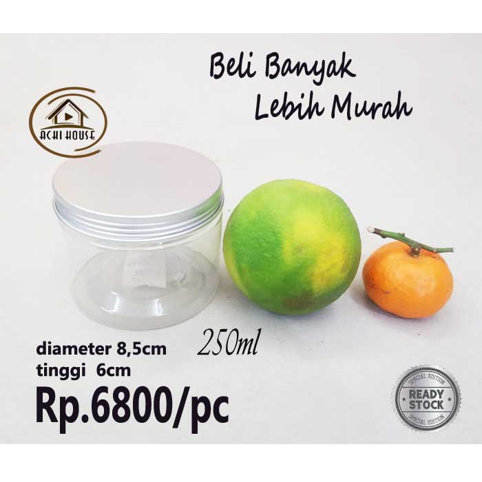 Selamat datang di Toko Achi house Kami menyediakan segala jenis kemasan botol plastik dan botol kaca. Harga yang ada di toko tersedia harga satuan dan harga grosir.Minimal pembelian satuan 3pc Tersedia harga grosiran lebih murah 12pc-60pc-120pc-600pc . Silakan cek harga grosir yang ada ini.Produk sesuai gambar.BOTOL PLASTIK PETDrat putar anti bocor. Plastik Solid Tebal , TUTUP ALUMINIUM SILVERKapasitas 250mlDiameter 8,5cm , Tinggi 6.5cmUntuk pengiriman jumlah banyak ada pilihan cargo murah MA atau Dakota Misalkan :tujuan Surabaya min 30kg adalah Rp150.000 (berat selanjutnya @Rp.3000)Dakota Rp. 1200/ kg Tujuan : Jakarta - Jakarta min 180kgs.Tips Packing Aman Setiap pembeli di harapkan membeli buble tambahan pelindung botol kaca. # 1x pembelian buble bisa packing max 12pc botol kaca ukuran dibawah 100ml, berlaku untuk kelipatan jumlah botol #. bukan pada ukuran ml botol. Bila anda tidak memesan buble tambahan resiko pecah tidak dapat di klaim 100%.Ready STOCK Dapat langsung dikirimPacking PASTI Aman. Transaksi Amanah.Produk berkualitas. Silakan diorder..Kirim 1 - 2 hari k