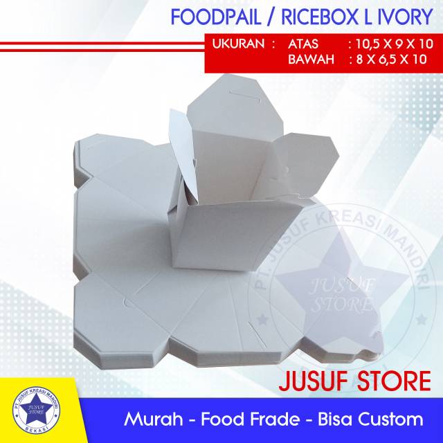 *Paper Foodpail Large 12 oz - Box Bento - Ricebox L putih*Dimensi: panjang x lebar x tinggi sisi atas: 10,5 x 9 x 10 cmsisi bawah: 8 x 6,5 x 10 cmHarga per pcs - minimal pembelian 1 pack isi 50 pcs.Pembelian perpack, kelipatan 50pcs, misal: 50,100,150, dst.Bahan Ivory 250 foodgrade laminasi dalam, tahan bocor.Aman digunakan dan cocok unutk berbagai makanan seperti:- Nasi/ mie/ bihun goreng- Ayam Goreng- Nasi Padang- Nasi Bento- Snack/ Gorengan- Mie kuahBisa cetak custom, minim order 1000pcs.Silakan chat admin kami untuk informasi harga dan pemesanan cetak custom kem