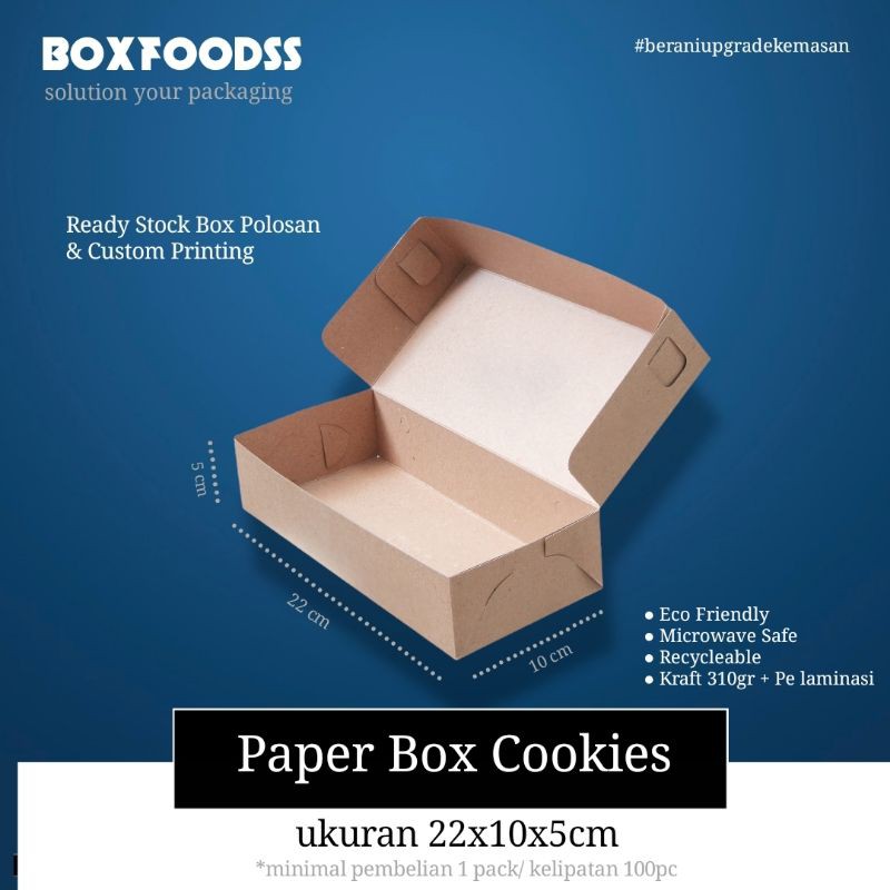 Paper cookies box Size 22x10x5cmBahan kertas kraft 275gr + Pe laminasi Kualitas terbaik , aman dan ramah lingkungan - bisa untuk berbagai makanan Nasi goreng - ayam geprek - risoles - pastel - gorengan - nasi goreng - ayam bakar - kue - roti - brownies .-------min order 1 pack isi 100pc--------------min order 1 pack isi 100pc--------------min order 1 pack isi 100pc-------.Kami juga menerima custom cetak sesuai brand sendiri Untuk cetak minimal order 1.000pc (proses tercepat dan terbaik 4-7 hari ) Dikirim dalam keadaan flat ( dirakit mudah dan praktis tanpa menggunakan lem/staples ) Barang ready jadi langsung diorder ajah partai kecil atau besar .Setiap order masuk akan kami proses secepatnya tanpa batasan waktu. Ekpedisi bisa menggunakan GRAB/GOJEK/SICEPAT GOKIl/JNE(JTR)/ANTErAJA/WAHANA Setelah order mohon selalu berikan ulasan dan masukan agar kami terus menjadi lebih baik.dan follow lapak kita Terima kasih sudah menjadikan boxfoodss partner solusi kemasan a