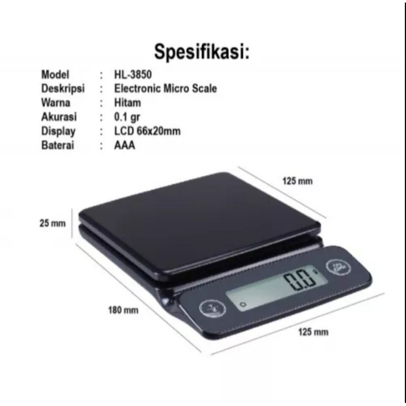Harnic Timbangan Kopi - Timbangan Dapur - Coffee Scale HL 3850Maksimal 3kg,Tombol Minimalispresisi akurasi 0.1gr, d=0,2grsatuan gr / lbMenggunakan baterai AAA (2 buah)Mohon tanyakan stok terlebih dahulu sebelum order terimakasih selamat berbe