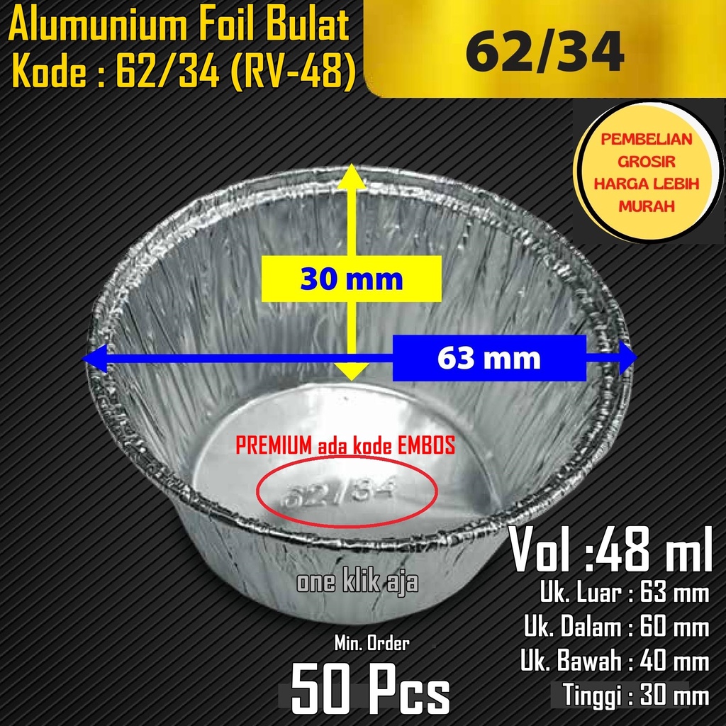 Name: Alumunium Foil Cup Bulat 62/34 [50 Pcs] Premium Aluminium Tray Rv 48 Tanpa Tutup [48ml] Diameter 6cm