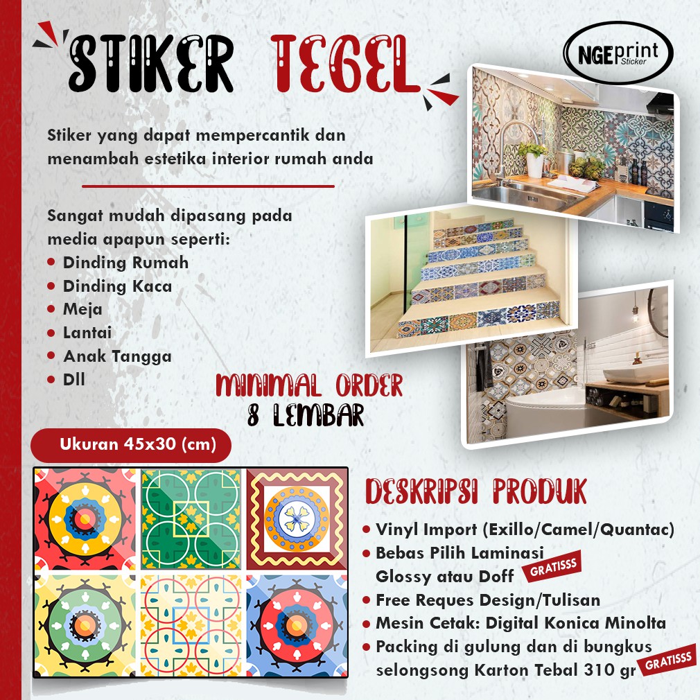 [SOFT LAUNCHING]STIKER TEGEL / STIKER DINDING / STIKER KERAMIK / WALL STIKER / STIKER LANTAI / STIKER MEJA KUNJUNGI STIKER TEGEL BAGIAN 1 DI TOKO INI UNTUK VARIASI MODEL LAIN===========================================MINIMAL ORDER : DESIGN ETALASE/CATALOG : 8 LEMBAR (DESIGN BOLEH CAMPUR) CUSTOM DESIGN : 10 LEMBAR / DESIGN=========================================== FREE DESIGN UNTUK POLA TEGEL BEBAS PILIH REVISI SAMPE FIX FREE LAMINASI GLOSSY/DOFF (BEBAS PILIH) FREE PACKING SELONGSONG KERTAS KARTON TEBAL 310/400 GR ===========================================DETAIL : HARGA ADALAH PERLEMBAR UKURAN 30 x 45 TERDIRI DARI 6 KOTAK UKURAN 15 CM X 15 CM STIKER MASIH BERBENTUK LEMBARAN (TIDAK DIPOTONG) TERBUAT DARI BAHAN VINYL IMPORT (QUANTAC/EXILLO/CAMEL/MERITEC) SUDAH DI LAMINASI BEBAS MELILIH GLOSSY/DOFF AGAR KUAT DAN TAHAN LAMA 1 KG MUAT 10 STIKER TEGEL===========================================CARA PASANG : PASTIKAN AREA YANG MENEMPEL SUDAH BEBAS DEBU, MINYAK, ATAU AIR. UKUR ARE YANG AKAN DITEMPEL GUNTING SESUAI KEPERLUAN TEMPEL LALU RATAKAN===========================================NOTES : TIDAK MELAYANI ORDERAN YANG DI BURU BURU===========================================CARA ORDER :- Silahkan pilih Variasi Model dan Tipe Laminasi yang di inginkan untuk Custom dan ingin melihan Catalog lain Silahkan chat/pm/inbox ya k