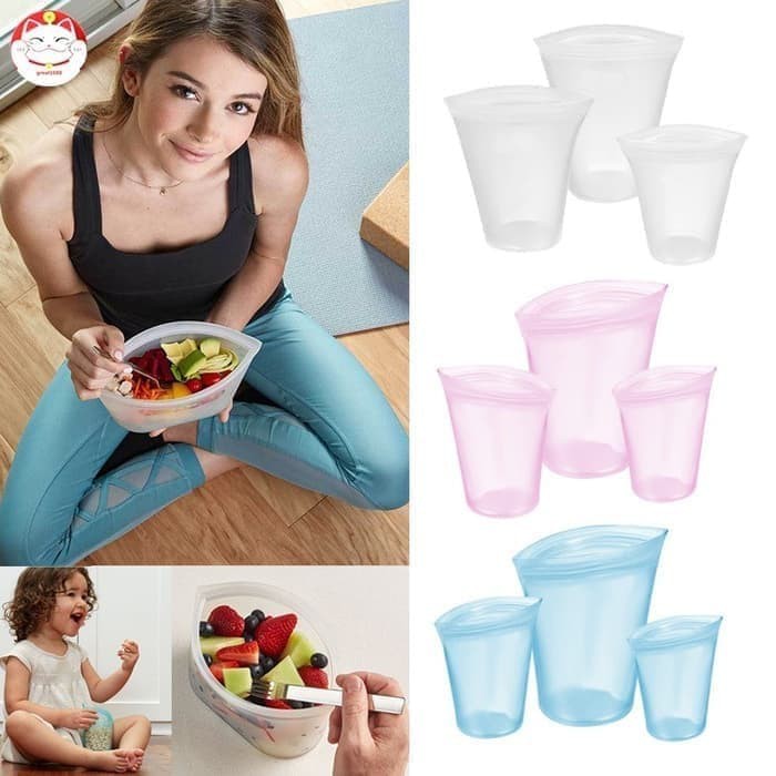 Deskripsi 3 Pcs Silicone Food Storage Bags - Kantong Silikon Tempat Makanan3Pcs Kantong Makanan Bahan Silikon Reusable Anti Bocor dengan ResletingDecription:Features:1. One this bag can replace 5000 disposable bags.2. A shape for every use -- even the weird stuff.3. They are food safe and can be microwaved and heated up to 425 Fahrenheit (220 Celsius).4. They're also flexible and expandable so you can use them in the freezer.5. They're great for packing and travel. Zip Top cups even fit in your car cup holder.Specification:Size:as shownMaterial: Food grade sil