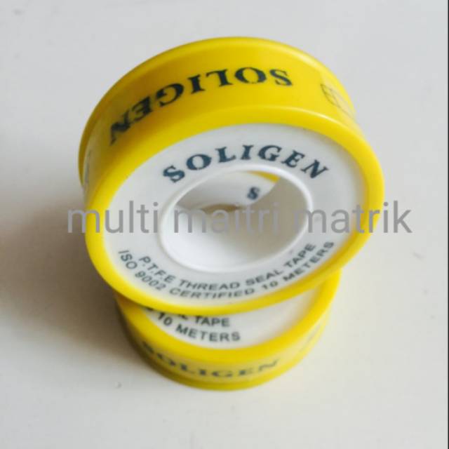 Seal Tape High Quality SOLIGENUkuran 12mm x 0.075mm x 10mDensity : 0.35g/cm3Berfungsi melapisi drat dari peralatan seperti keran/fitting/nipple/dll untuk mencegah keboco