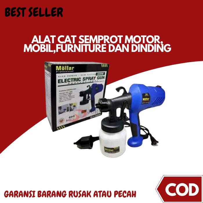 Produk ini sudah melalui proses pengecekan yang sangat ketat (Quality Control) Sangat dipastikan Berfungsi dengan baik secara keseluruhan.Spray Gun ElektrikBrand : MollarTipe : ESG300Voltage : 230V-50Hz Cup capacity : 800ml Input power : 300W Max. Delivery : 400ml/min Max. viscosity : 40din/sec Nozzle size : 2.5mmProduk ini cocok untuk mengecat pada permukaan bidang luas seperti tembok, furniture, pagar, body kendaraan dan pengecatan lain