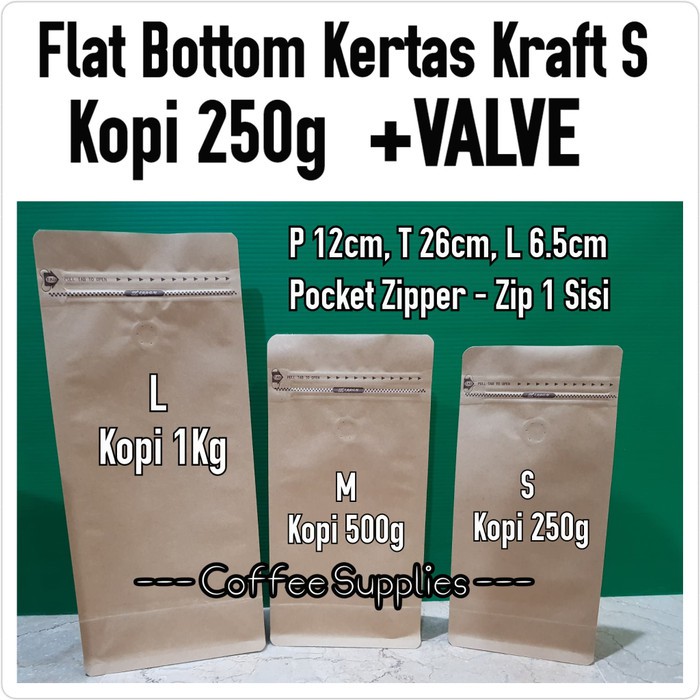 FLAT BOTTOM KERTAS KRAFT S + VALVEUntuk kemasan kopi sangrai 250gSudah terpasang valve satu arah (6 titik) Valve untuk mengeluarkan gas satu arah dari dalam kemasan agar tidak menggelembung Pocket Zipper - Zip 1 Sisi Kemasan harus di segel dengan impulse sealerHarga untuk 1 kantongMinimum pembelian = 10pcsUkuran: S ( 12cm x 20cm x 6.5cm) Warna: Coklat Material : Kertas Kraft (bisa di stempel)Ketebalan: 130 micronKapasitas kopi sangrai : 250gKelebihan kemasan Flat Bottom:- Dengan design flat bottom kemasan bisa berdiri dengan firm, tegak tanpa sandaran- Dengan POCKET SIDE ZIP, kemasan lebih praktis. Bisa langsung di isi dengan produk tanpa harus membuka zip/klip kemasan satu per satu- Ada "kuping" untuk sobek buka kemasan. Kemasan mudah di buka dengan rapih- Premium zip lock, kemasan bisa di tutup kembali setelah di bukaNote: Setelah di isi dengan produk, untuk menutup kemasan perlu di press dengan impulse s